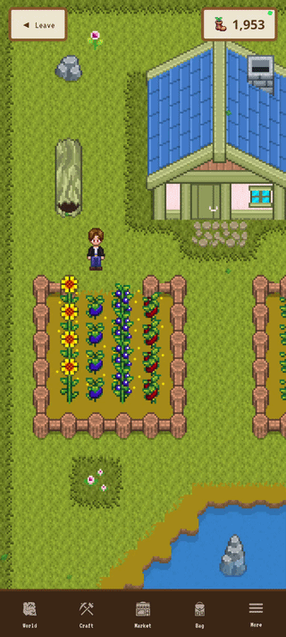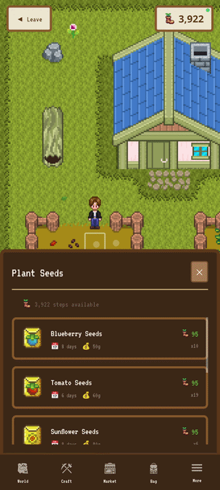 Walk in the real world. Earn steps. Plant seeds. Water your crops daily. Watch them grow in real time. Harvest when they're ready. Sell on the marketplace or to NPCs. Level up your farming mastery. Unlock better quality, cheaper costs, and rarer seeds. Expand your farm. Repeat.