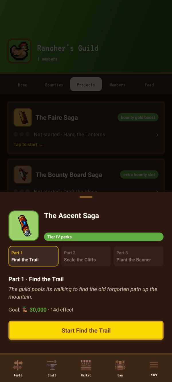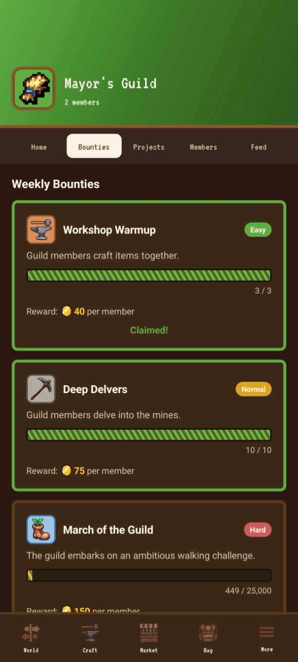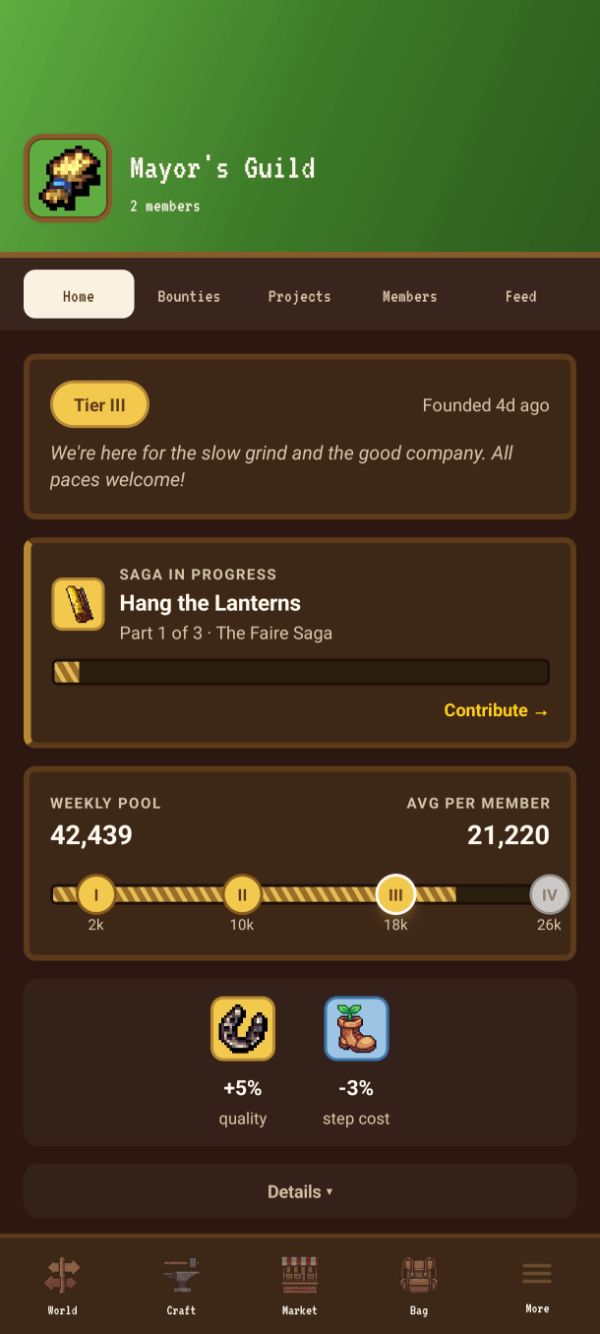 Walk in the real world. Your steps automatically feed your guild's weekly pool. Hit tier thresholds together for passive bonuses. Complete bounties as a group just by playing normally. Pool gold or steps into sagas for time-limited buffs. Repeat.