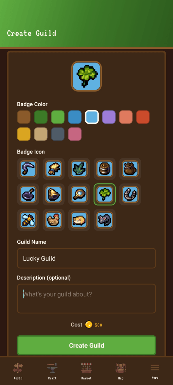 Anyone can create a guild for 500 gold. You pick a name, choose a badge icon and color, and decide whether it's Invite-only or Open. Invite-only guilds require a code to join. Open guilds show up in a public browser for anyone to find. If you'd rather join than create, you can browse open guilds or enter a code from a friend.